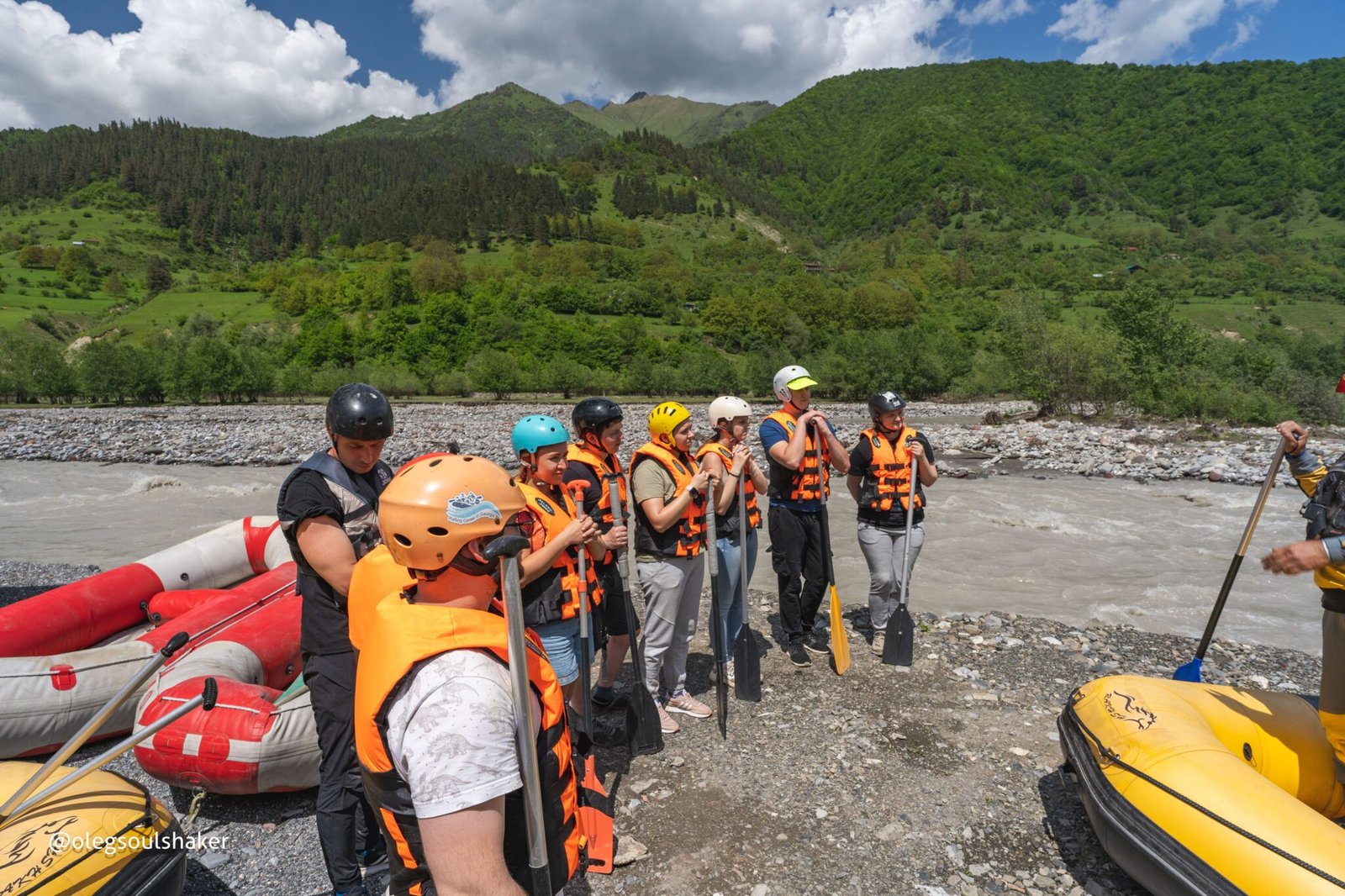 После треккинга и перекуса наступает время для нового вызова — рафтинга по реке Арагви.